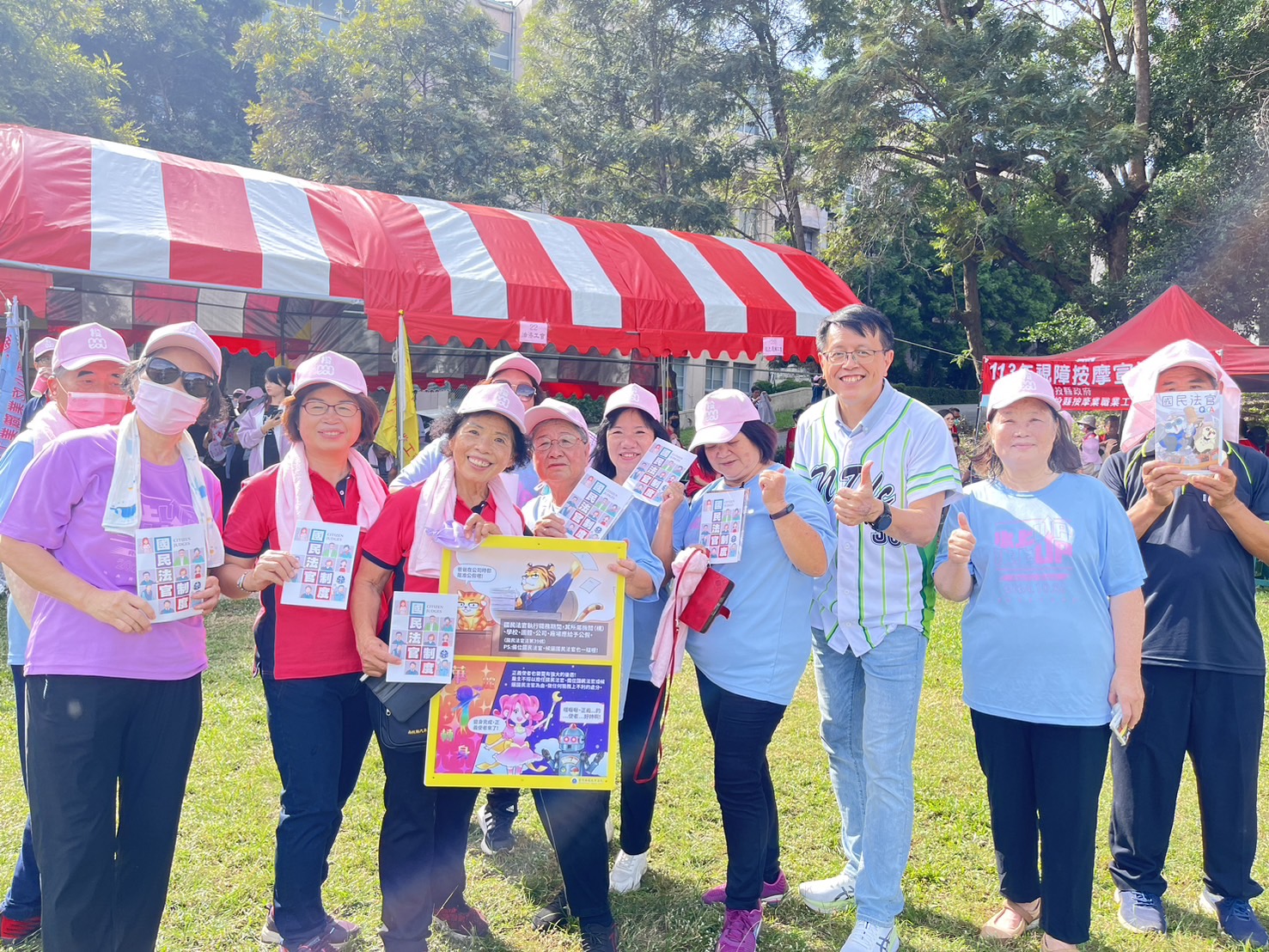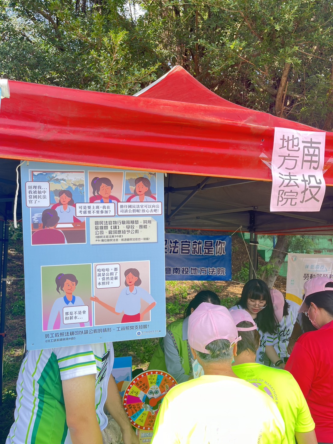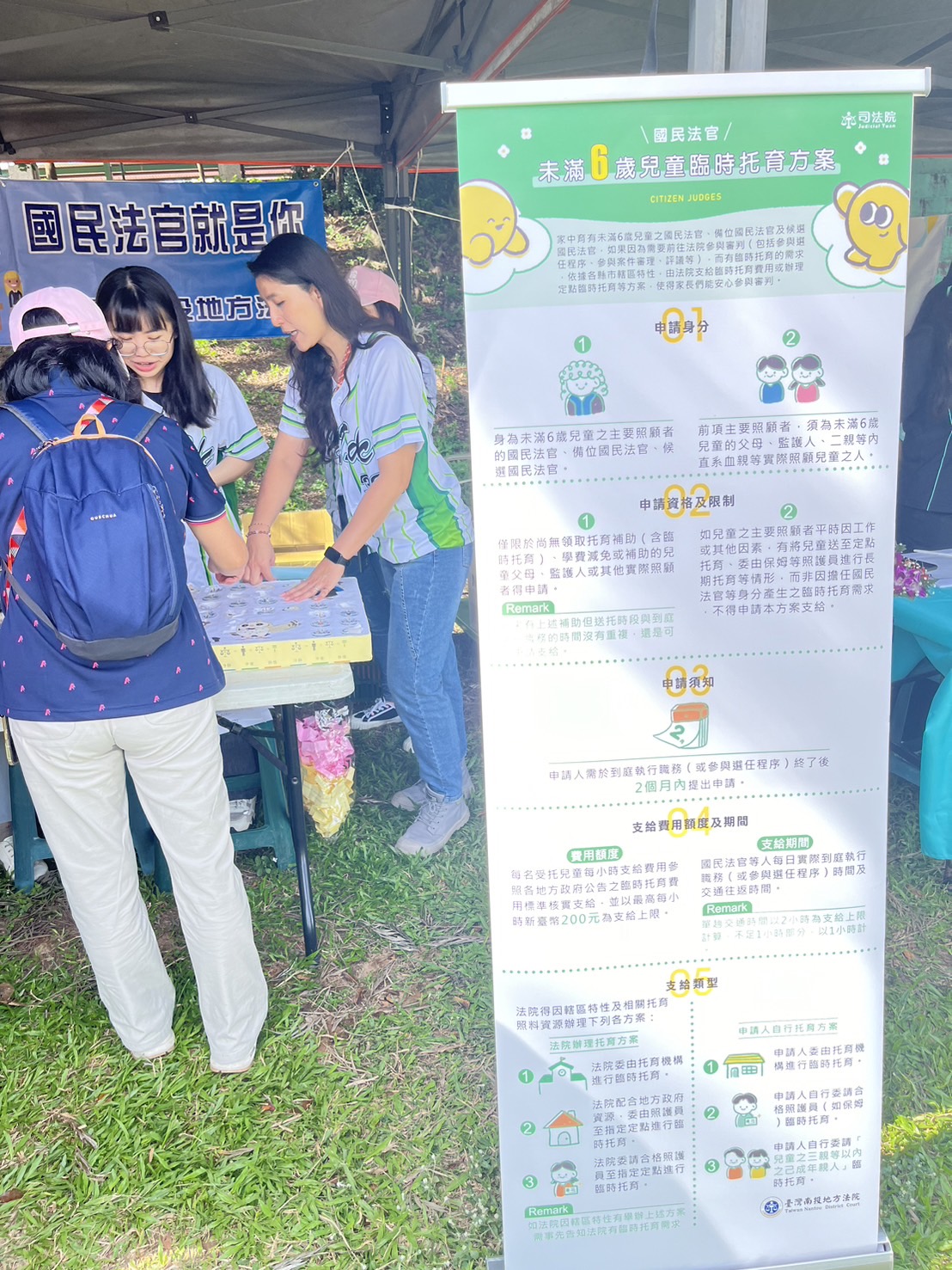 臺灣南投地方法院為推廣國民法官新制內容,於113年11月9日假南投縣勞工運動大會擴大宣導,本次宣傳本院特別強調勞工擔任國民法官期間雇主應給予公假,勞工倘有托育的需求也能依各縣市特性,由法院支給臨時托育費用或辦理定點臨時托育等方案,使家長們能安心參與審判。