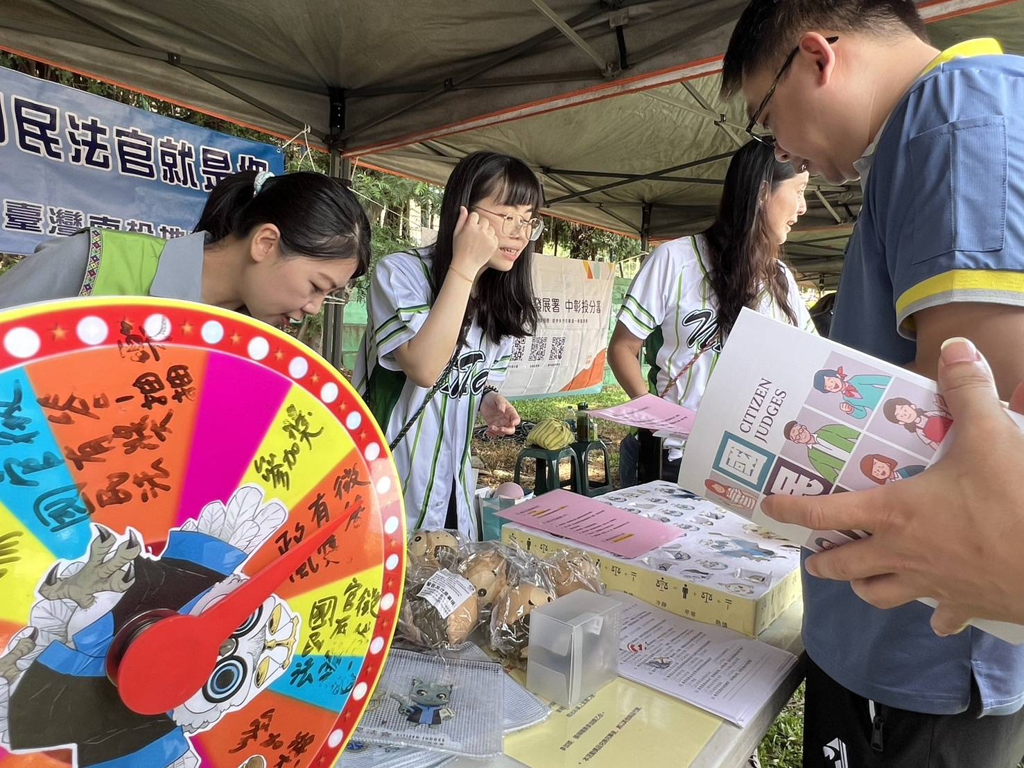 活動在本縣各工會進場後開始進行,由南投地方法院王邁揚院長帶領法院同仁邀請民眾參與,除發送國民法官新制文宣,院長亦就勞工擔任國民法官期間有無車馬費及報酬之疑問逐一解答並說明國民法官新制內涵,攤位更準備了歡樂轉盤與抽抽樂吸引民眾進行國民法官新制及政風反賄選有獎徵答,現場反應熱烈,參與踴躍。
